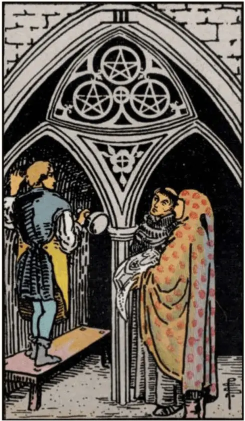 펜타클 3번 카드는 협업과 기술의 성취를 상징하는 이미지를 포함하고 있습니다. 주요 상징은 다음과 같습니다: