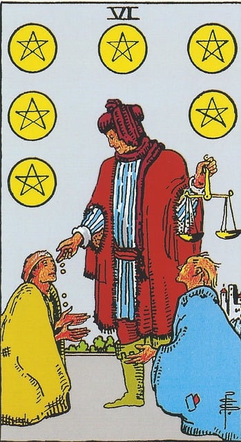 펜타클 6번 카드는 나눔과 조화를 상징하는 이미지를 담고 있습니다. 주요 상징은 다음과 같습니다: