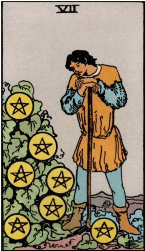 펜타클 7번 카드는 인내와 성찰을 상징하는 이미지를 담고 있습니다. 주요 상징은 다음과 같습니다: