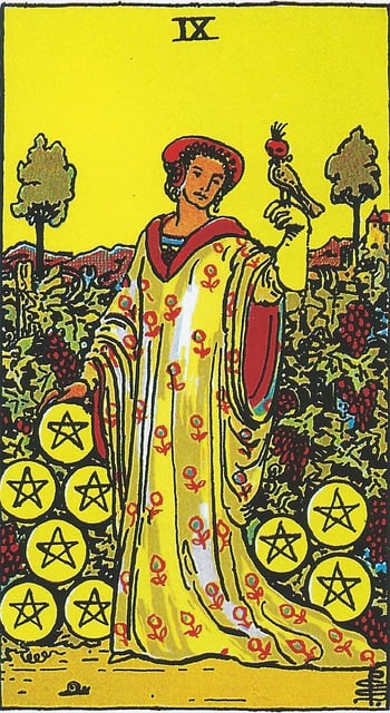 펜타클 9번 카드는 물질적 안정과 개인적 성취를 상징하며, 자신의 노력이 결실을 맺는 시기를 나타냅니다. 주요 긍정적인 해석은 다음과 같습니다: